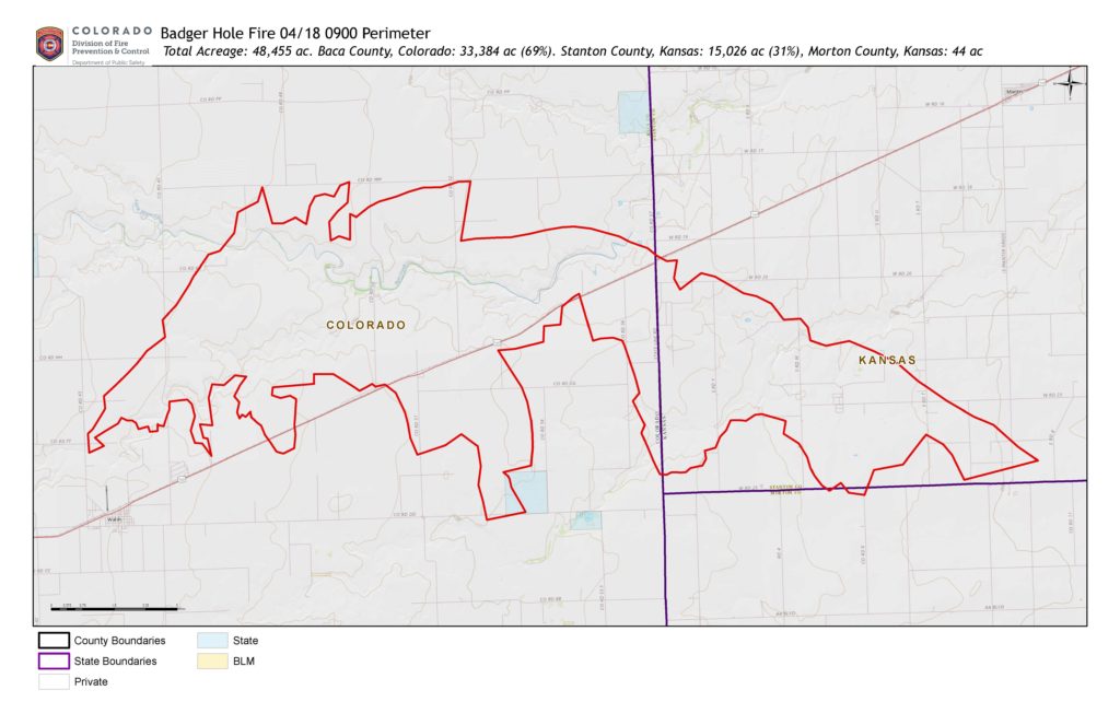 As of 4:00 p.m. Wednesday, most recent totals of the Badger Hole Fire, which began April 17 in the early hours of the afternoon and is located in eastern Baca County and western Kansas, is 48,455 acres, with 33,384 acres in Colorado and 15,026 acres in Kansas; it is currently 85 percent contained. Multiple homes and outbuildings have been lost; livestock losses are being reported but verified numbers were not available at time of this release. Those who have lost livestock or property should document all losses with location details and photographic evidence.